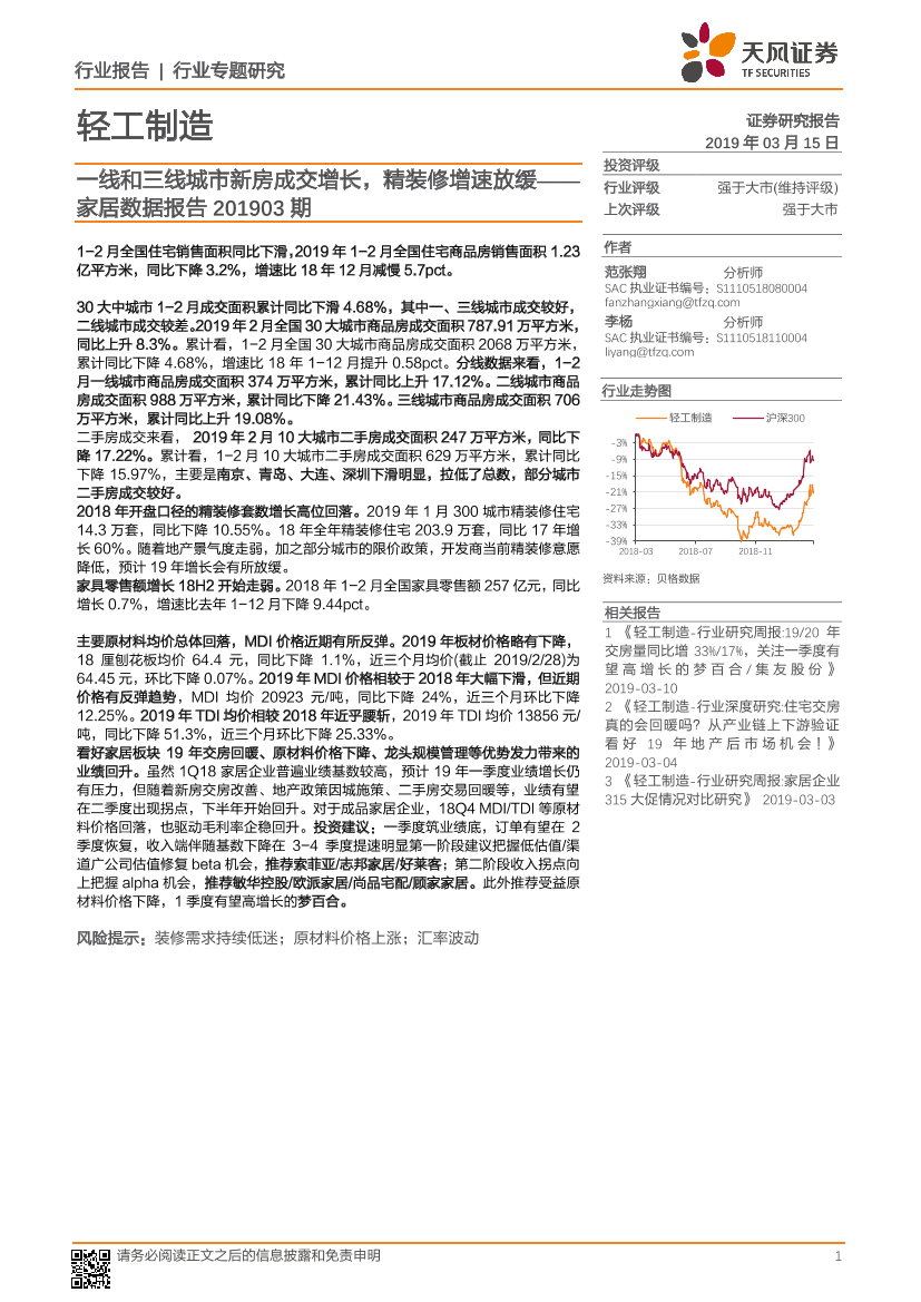 文件名称:轻工制造行业家居数据报告201903期:一线和三线城市新房成交增长,精装修增速放缓-20190315-天风证券-14页.pdf